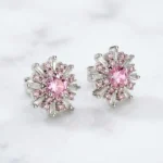 Su diseño floral con piedra central rosada y detalles radiantes crea una pieza llamativa y delicada, ideal para aportar color, luz y un toque romántico a cualquier look.