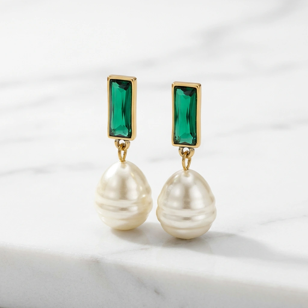 Aretes de perla natural con imitacion de circon color verde esmeralda